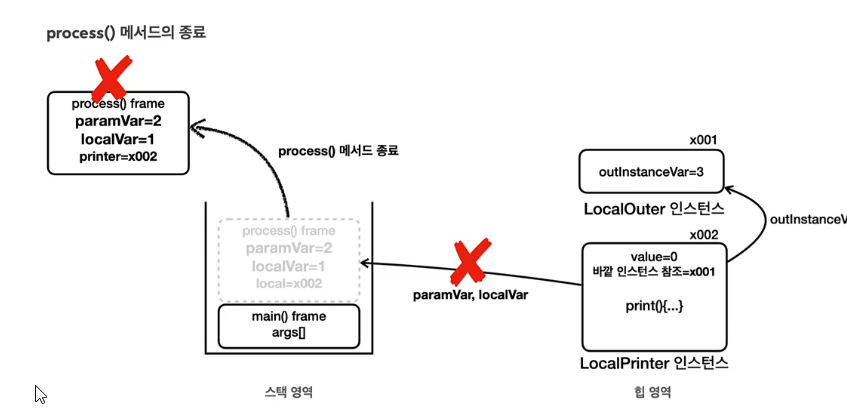 LocalPrinter 인스턴스에 있는 print() 메서드는 지역 변수인 paramVar, localVar에 접근 해야한다. 하지만 process 메서드가 이미 종료되었으므로 해당 지역 변수 또한 제거된 상태이다.