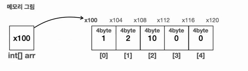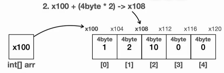 배열의 시작 참조(x100) + (자료의 크기(4byte) * 인덱스 위치(2)) = x108이 나온다. 여기에는 숫자 10이 들어있다.