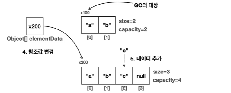 배열 리스트는 보통 데이터를 중간에 추가하고 삭제하는 변경 보다는, 데이터를 순서대로 입력하고(데이터를 마지막에 추가하고), 순서대로 출력하는 경우에 가장 효율적이다.