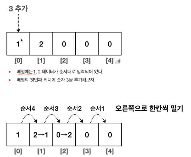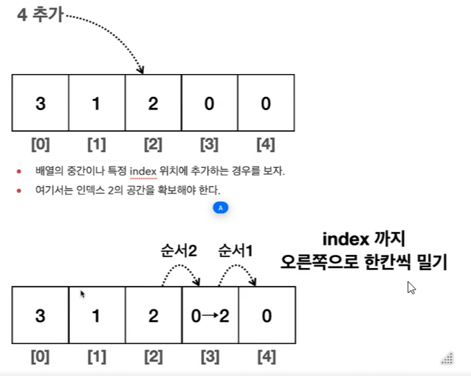 ->데이터를 추가하려면 새로운 데이터를 입력할 공간을 확보해야 한다. 따라서 기존 데이터를 오른쪽으로 한칸 씩 밀어야한다.