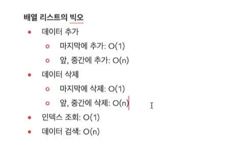 배열 리스트는 마지막에 데이터를 추가하거나 마지막에 있는 데이터를 삭제할 때는 O(1)로 매우 빠르지만, 중간에 데이터를 추가하거나 삭제하는 경우에는 O(n)으로 느리다.