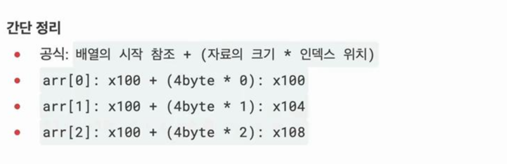 따라서 배열의 시작 위치인 x100부터 시작해서 자료의 크기(4byte)와 인덱스 번호를 곱하면 원하는 메모리 위치를 찾을 수 있다.