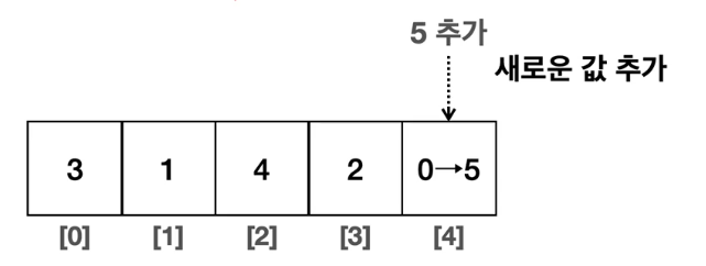- 배열의 마지막 위치에 데이터를 추가하는 경우 기존 데이터를 이동하지 않아도 된다. 따라서 단순하게 값만 입력하면 된다.