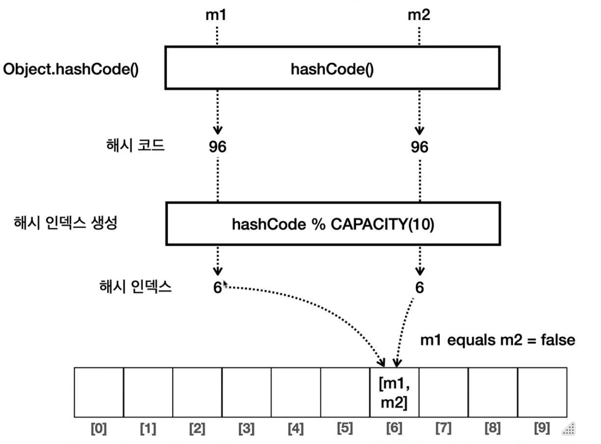 하지만 m1과 m2의 해시 코드가 서로 다르기 때문에 다른 위치에 각각 저장된다