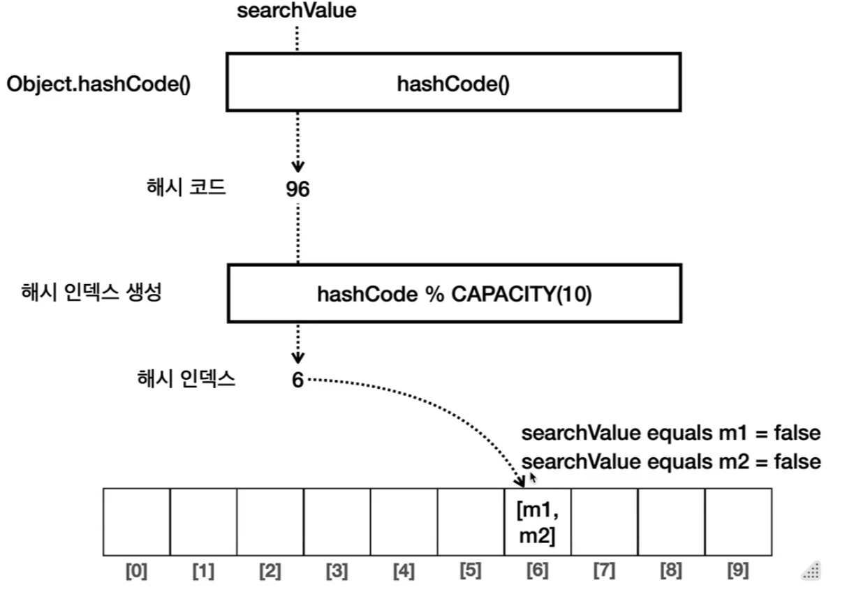 MemberOnlyHash는 equals()를 재정의 하지 않았으므로 Object의 equals()를 상속 받아서 사용한다. 따라서 인스턴스의 참조값을 비교한다. 인스턴스가 서로 다른 searchValue와 m1,m2는 비교에 실패한다.