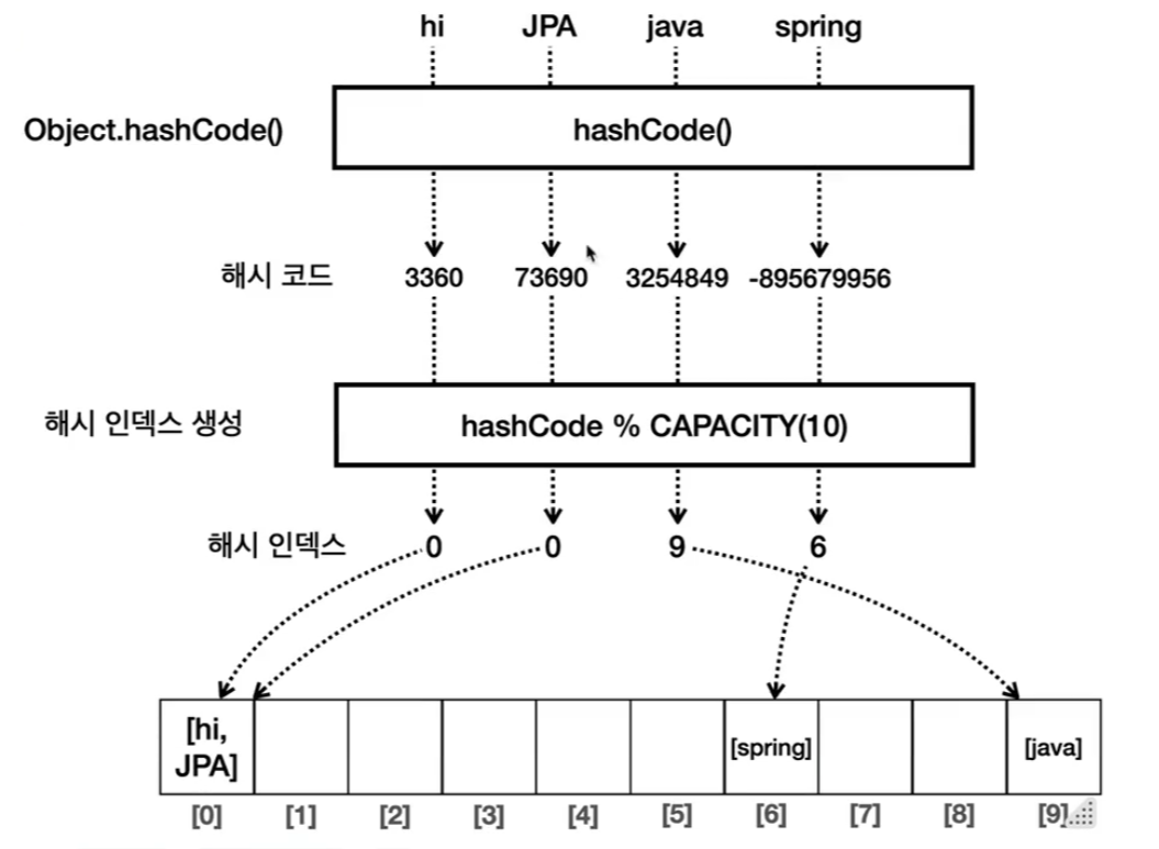 - 앞서 직접 만든 해시 함수의 해시 코드 충돌의 예