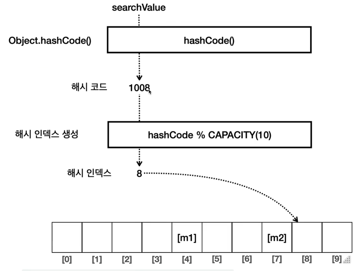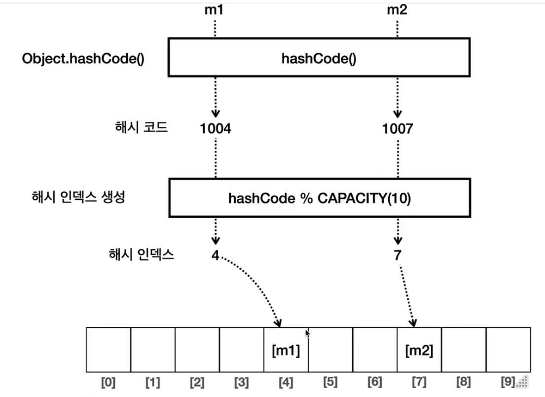 하지만 m1과 m2의 해시 코드가 서로 다르기 때문에 다른 위치에 각각 저장된다