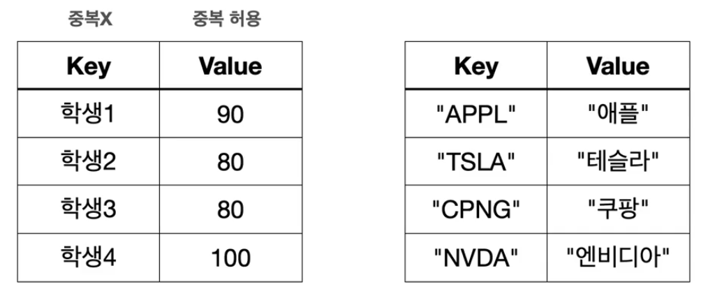 - 키는 중복될 수 없지만, 값은 중복될 수 있다.