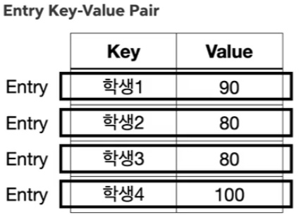 쉽게 이야기해서 우리가 Map에 키와 값으로 데이터를 저장하면 Map은 내부에서 키와 값을 하나로 묶는 Entry객체를 만들어서 보관한다. 참고로 하나의 Map에 여러 Entry가 저장될 수 있다.