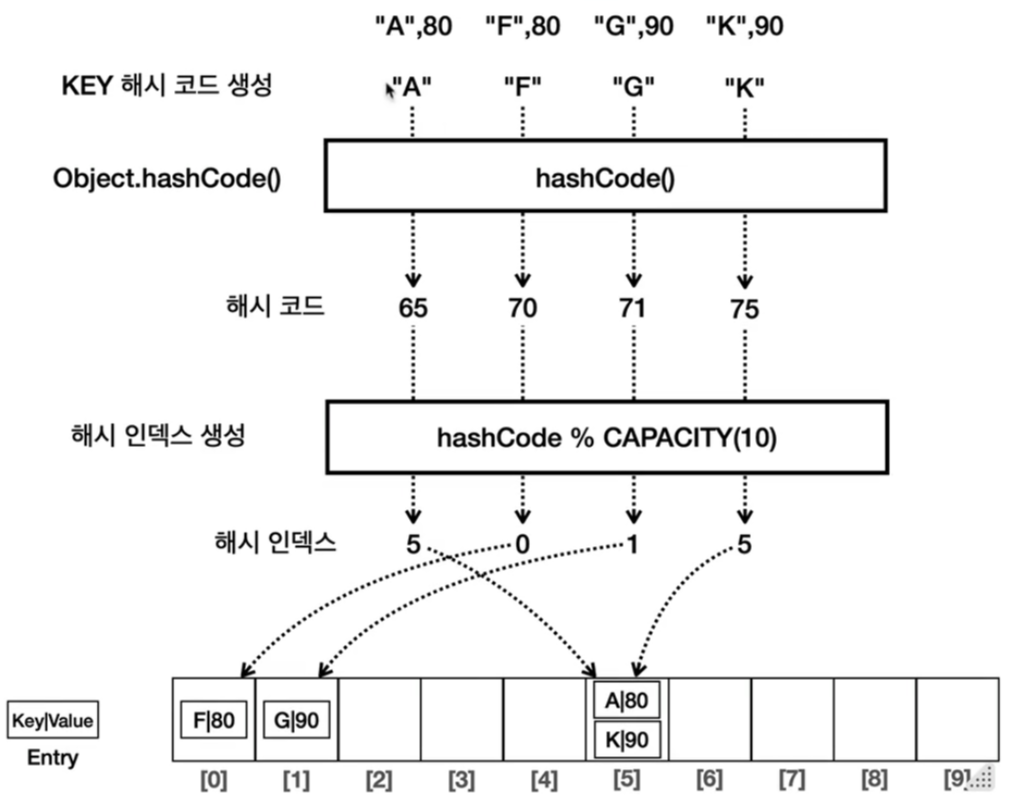 쉽게 이야기해서 우리가 Map에 키와 값으로 데이터를 저장하면 Map은 내부에서 키와 값을 하나로 묶는 Entry객체를 만들어서 보관한다. 참고로 하나의 Map에 여러 Entry가 저장될 수 있다.