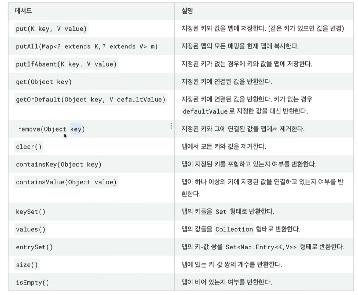 Map인터페이스의 주요 메서드는 다음과 같다.