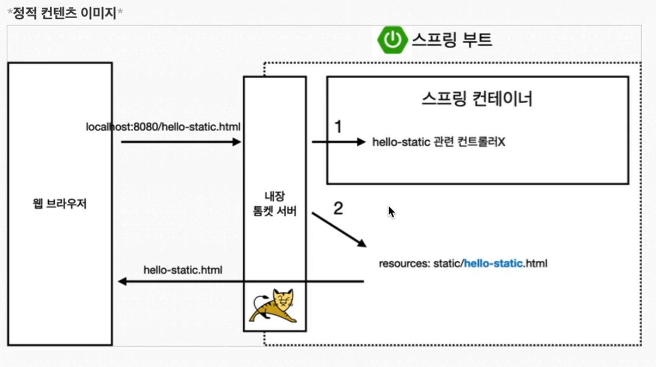 스프링은 hello-static에 관련된 컨트롤러를 찾아보고, 없다면 resources:static/hello-static.html을 반환한다.