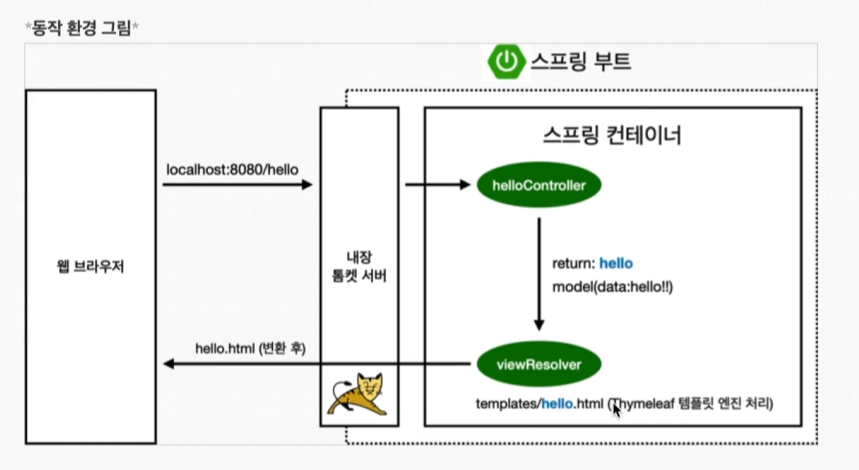 웹 브라우저에서 localhost:8080에 hello-mvc를 넘기면 스프링 부트를 띄울때 같이 뜨는 내장 톰캣 서버에 넘긴다.
