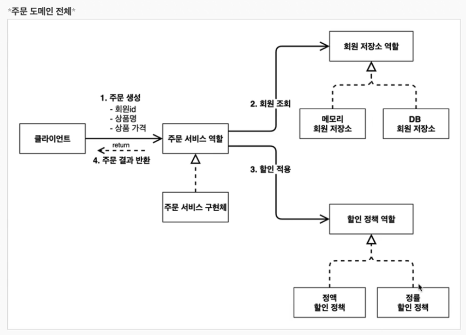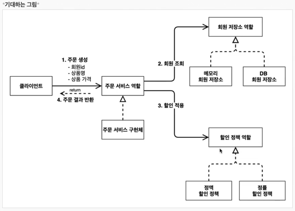 - 클라이언트 코드가 'DiscountPolicy'추상화 인터페이스에만 의존하도록 코드를 변경했다.
