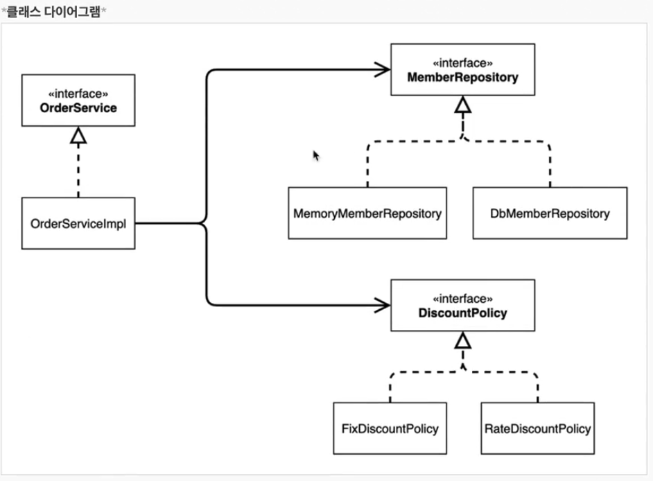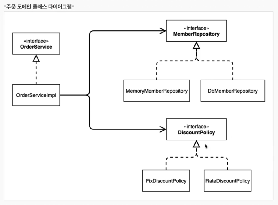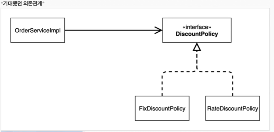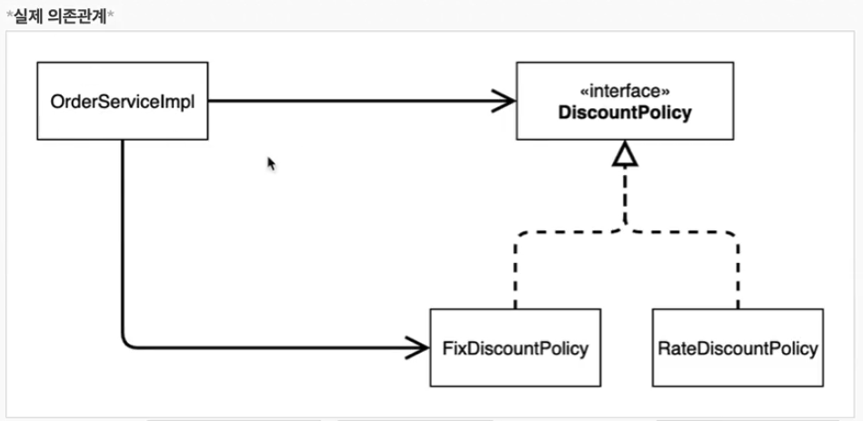 - OrderServiceImpl은 DiscountPolicy인터페이스에 의존한다. 실제 어떤 구현 객체가 사용될지는 모른다.