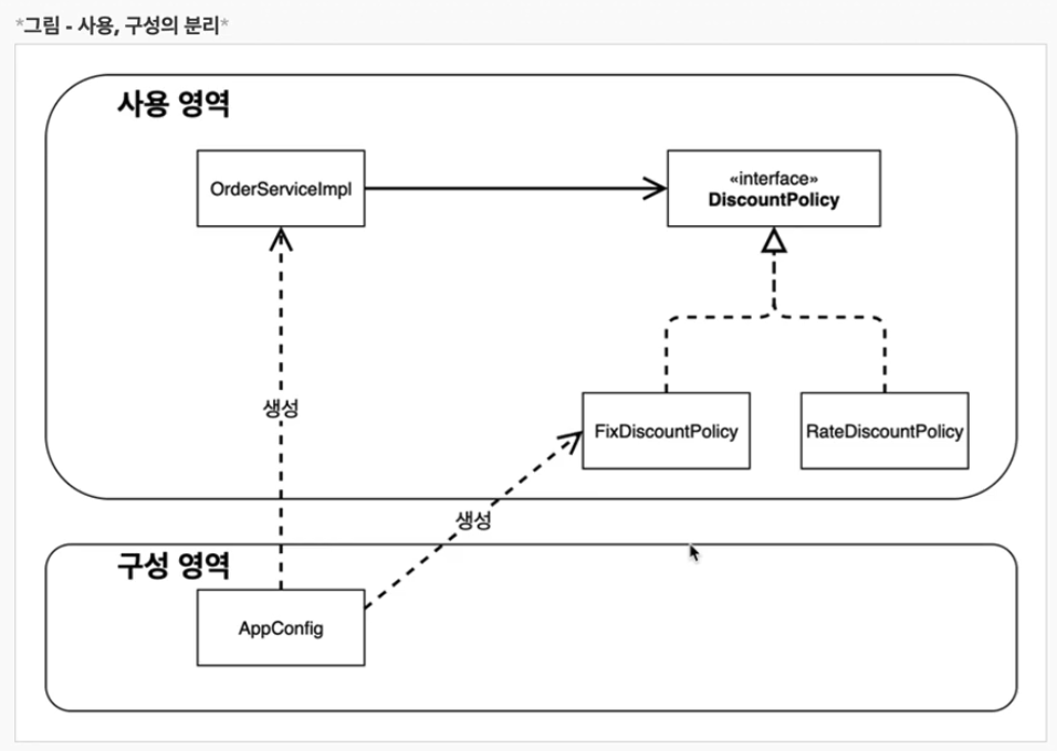 - *구성 영역은 당연히 변경된다. 구성 역할을 담당하는 AppConfig를 애플리케이션이라는 공연의 기획자로 생각하자. 공연 기획자는 공연 참여자인 구현 객체들을 모두 알아야 한다.