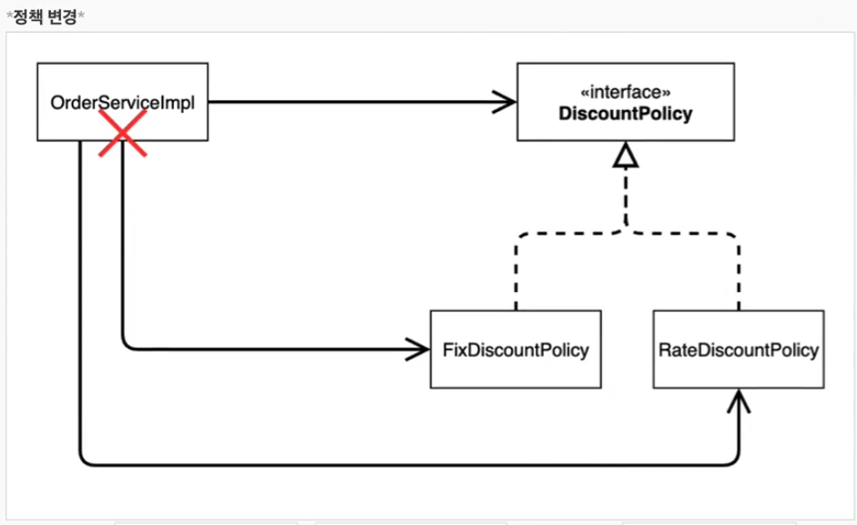 - AppConfig가 의존 관계를 FixDiscountPolicy -> RateDiscountPolicy로 변경해서 클라이언트 코드에 주입하므로 클라이언트 코드는 변경하지 않아도 됨