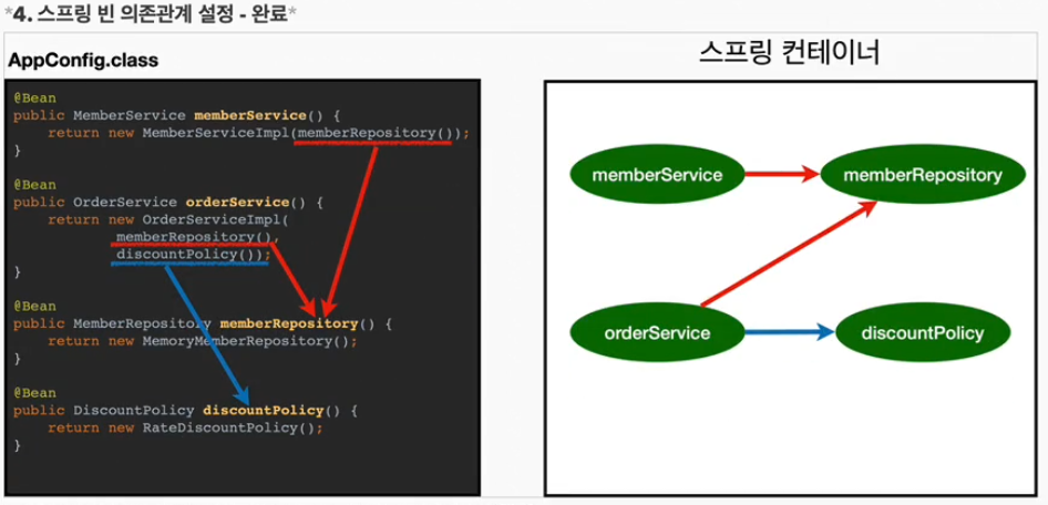 참고 : 스프링은 빈을 생성하고, 의존관계를 주입하는 단계가 나누어져 있다. 그런데 이렇게 자바 코드로 스프링 빈을 등록하면 생성자를 호출하면서 의존관계 주입도 한번에 처리된다.