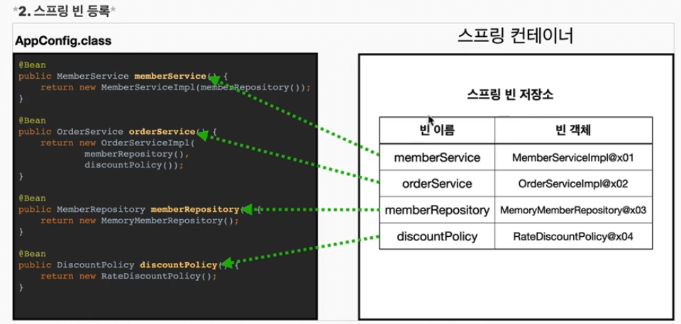 - 스프링 컨테이너는 파라미터로 넘어온 설정 클래스 정보를 사용해서 스프링 빈을 등록한다.