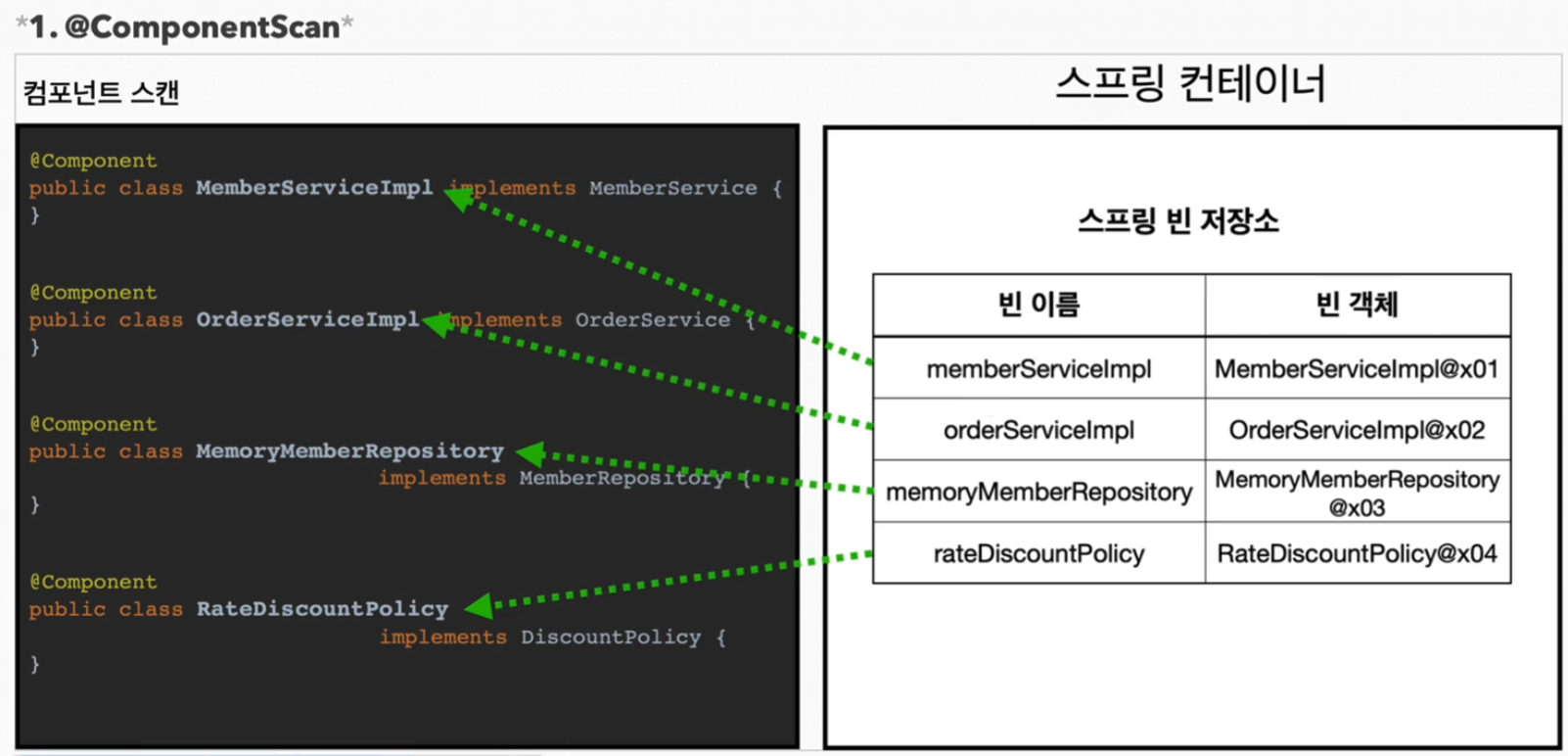 - @ComponentScan은 @Component가 붙은 모든 클래스를 스프링 빈으로 등록한다.