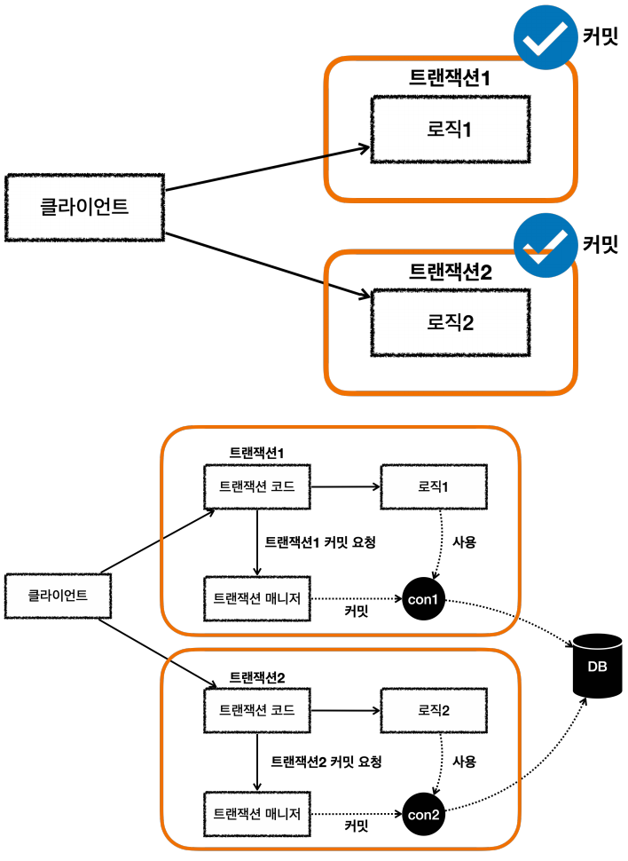 스프링 트랜잭션 전파 1 - 커밋 롤백트랜잭션이 둘 이상 있을 때 어떻게 동작하는지 자세히 알아보고, 스프링이 제공하는 트랜잭션 전파(propagation)라는 개념도 알아보자.트랜잭션 전파를 이해하는 과정을 통해서 스프링 트랜잭션의 동작 원리도 더 깊이있게 이해할 수 있다. 우선 간단한 예제 코드로 스프링 트랜잭션을 실행해보자.@Slf4j@SpringBootTestpublic class BasicTxTest { @Autowired PlatformTransactionManager txManager; @TestConfiguration static class Config { @Bean public PlatformTransactionManager transacti..