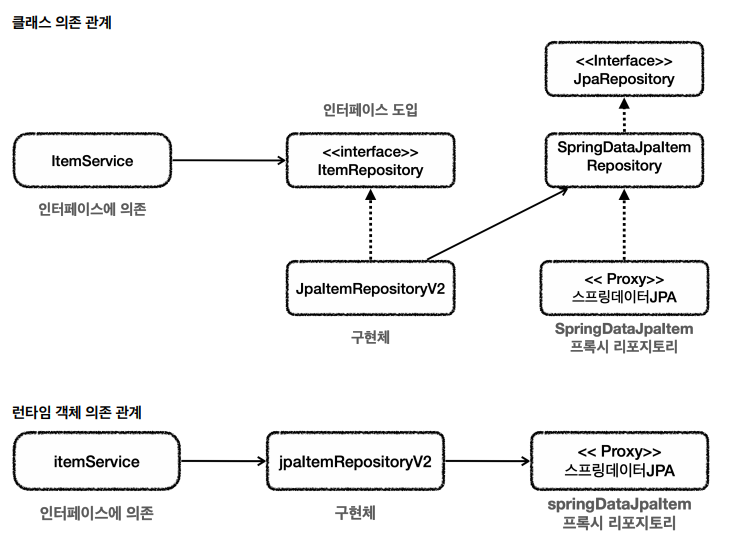 스프링 데이터 JPA 예제와 트레이드 오프스프링 데이터 JPA 예제를 다시 한번 돌아보자.- 중간에서 JpaItemRepositoryV2가 어댑터 역할을 해준 덕분에 ItemService가 사용하는 ItemRepository 인터페이스를 그대로 유지할 수 있고, 클라이언트인 ItemService의 코드를 변경하지 않아도 되는 장점이 있다. 고민- 구조를 맞추기 위해서, 중간에 어댑터가 들어가면서 전체 구조가 너무 복잡해지고 사용하는 클래스도 많아지는 단점이 생겼다.- 실제 이 코드를 구현해야 하는 개발자 입장에서 보면 중간에 어댑터도 만들고, 실제 코드까지 만들어야 하는 불편함이 생긴다.- 유지보수 관점에서 ItemService를 변경하지 않고, ItemRepository의 구현체를 변경할 수 있는 장점..