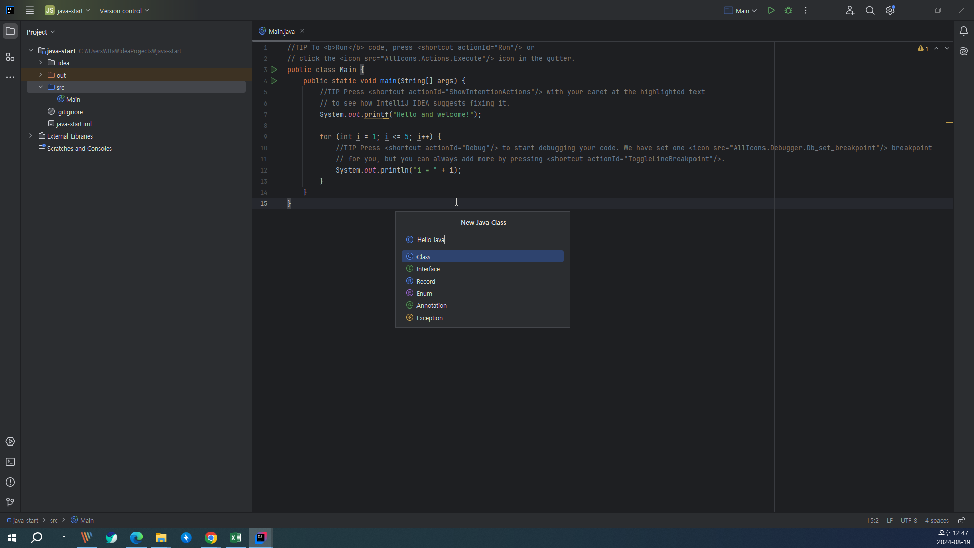 인텔리제이로 Hello World 출력하기