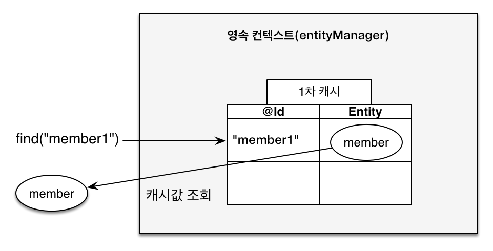 만약 이 상태에서 em.find("member1')을 찾게 되면 DB를 찾지 않고 1차 캐시를 우선적으로 찾게 된다. 캐시에 값이 있으면 그대로 조회해 온다.