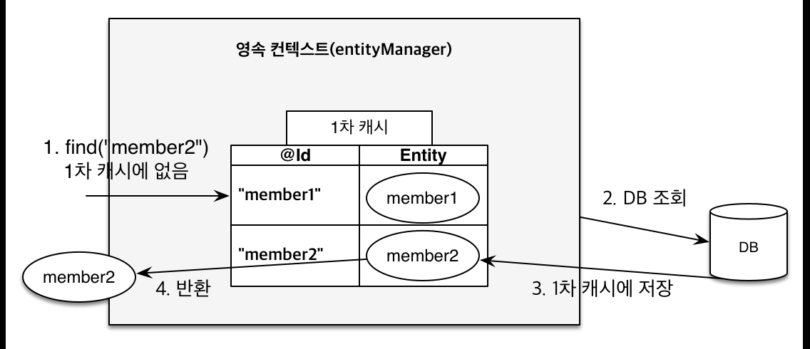 만약 em.find("member2")를 조회하는데 1차 캐시에 없다면, DB를 조회하여 member2를 1차 캐시에 저장하고 반환한다.