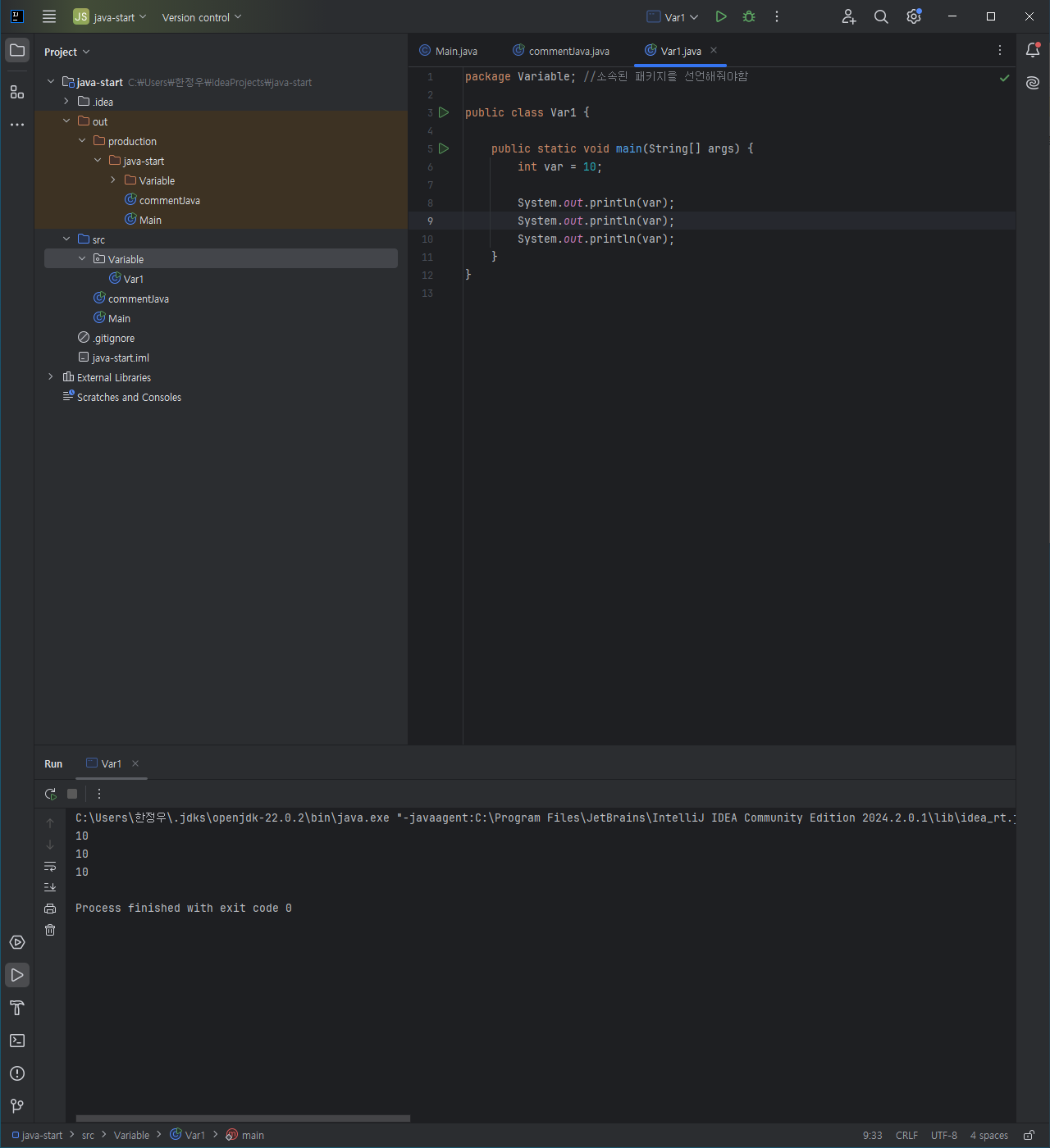 int var = 10; 으로 var 변수를 선언과 동시에 초기화를 진행하였다.