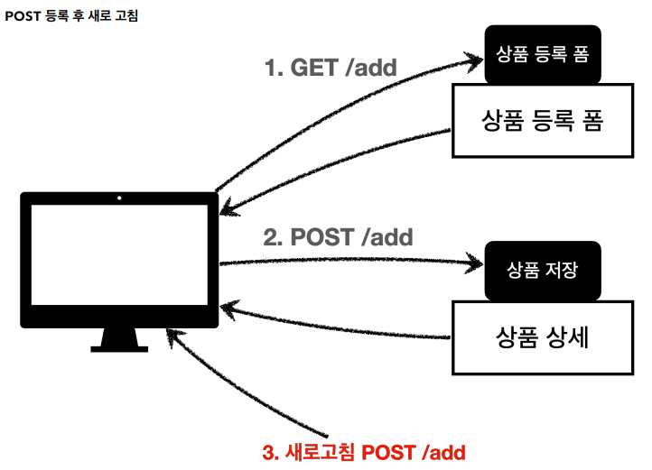 이 상태에서 새로고침을 또 선택하면 마지막에 전송한 'POST/add + 상품 데이터'를 서버로 다시 전송하게 된다.