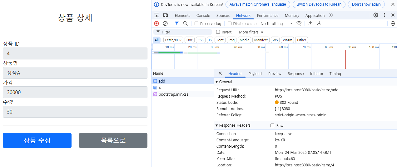 redirect를 보게 되면 basic/items/{itemId}로 리다이렉트가 되는 것을 볼 수 있다.