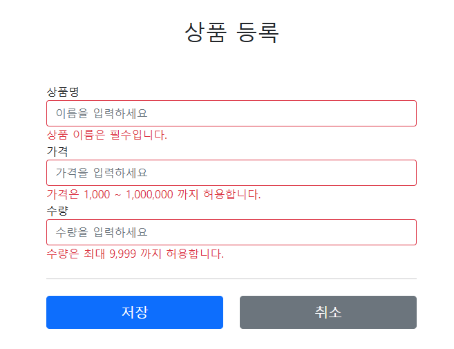 고객이 상품 등록 폼에서 상품명을 입력하지 않거나, 가격, 수량 등이 너무 작거나 크게 설정되어 검증 범위를 넘어서면, 서버 검증 로직이 실패해야 한다. 이렇게 검증에 실패한 경우 고객에게 다시 상품 등록 폼을 보여주고, 어떤 값을 잘못 입력했는지 친절하게 알려주어야 한다.
