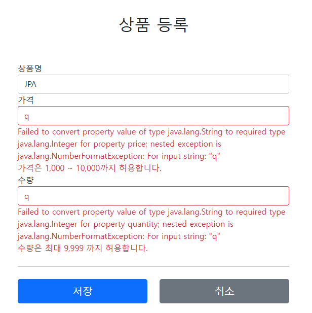 Field error in object 'item' on field 'price': rejected value [ㅁ]; codes [typeMismatch.item.price,typeMismatch.price,typeMismatch.java.lang.Integer,typeMismatch]; arguments [org.springframework.context.support