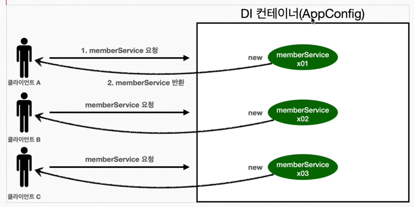 웹 애플리케이션과 싱글톤- 스프링은 태생이 기업용 온라인 서비스 기술을 지원하기 위해 탄생했다.- 대부분의 스프링 애플리케이션은 웹 애플리케이션이다. 물론 웹이 아닌 애플리케이션 개발도 얼마든지 개발할 수 있다.- 웹 애플리케이션은 보통 여러 고객이 동시에 요청을 한다.계속 요청이 올때마다 memberService객체가 새로 생성이 될까??Test코드를 통해 확인해보자. public class SingletonTest { @Test @DisplayName("스프링 없는 순수한 DI 컨테이너") void pureContainer(){ AppConfig appConfig = new AppConfig(); //1. 조회 : 호출할 때 마다 객체를 생성 Me..