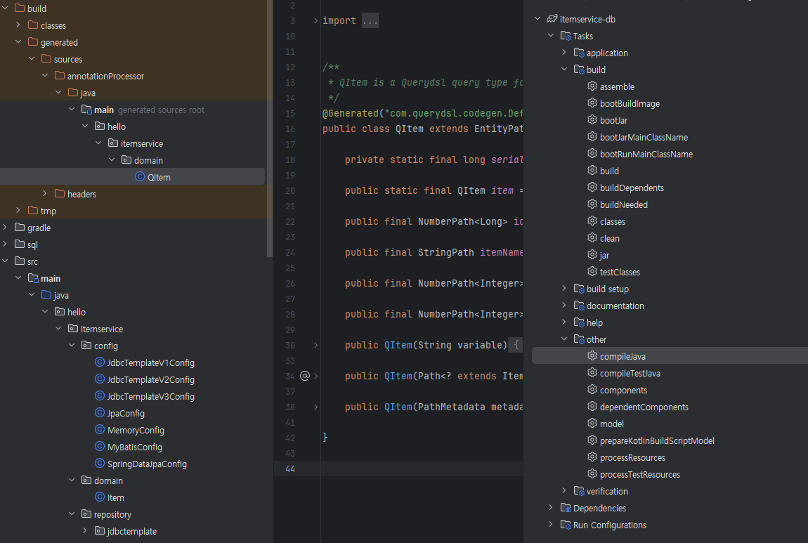 Querydsl 설정우선 Querydsl을 설정해보자. 스프링 2.x대의 설정과 3.x대의 설정이 다르므로 잘 확인해보자. 2.x 버전 설정//Querydsl 추가implementation 'com.querydsl:querydsl-jpa'annotationProcessor "com.querydsl:querydsl-apt:${dependencyManagement.importedProperties['querydsl.version']}:jpa"annotationProcessor "jakarta.annotation:jakarta.annotation-api"annotationProcessor "jakarta.persistence:jakarta.persistence-api" 3.x 버전 설정//Querydsl 추가..
