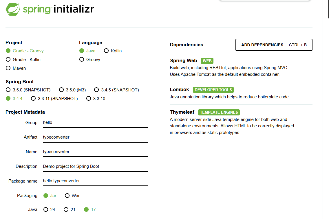 우선 스프링 프로젝트를 하나 생성해주도록 하자. 스프링 타입 컨버터 소개문자를 숫자로 변환하거나, 반대로 숫자를 문자로 변환해야 하는 것처럼 애플리케이션을 개발하다 보면, 타입을 변환해야 하는 경우가 상당히 많다.@RestControllerpublic class HelloController { @GetMapping("/hello-v1") public String helloV1(HttpServletRequest request) { String data = request.getParameter("data");//문자 타입 조회 Integer intValue = Integer.valueOf(data); System.out.println("intValue = "..
