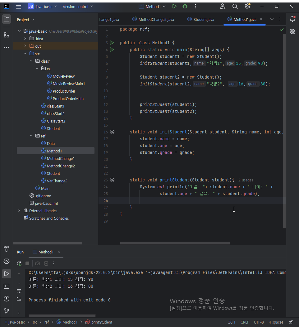 프로그래밍은 크게 절차 지향 프로그래밍과 객체 지향 프로그래밍으로 나눌 수 있다 절차 지향 프로그래밍1. 이름 그대로 절차를 지향한다 실행 순서를 중요하게 생각하는 방식이다.2. 절차 지향 프로그래밍은 프로그램의 흐름을 순차적으로 따르며 처리하는 방식이다. 즉, "어떻게"를 중심으로 프로그래밍 한다. 객체 지향 프로그래밍1. 객체를 지향한다, 객체를 중요하게 생각한다.2. 실제 세계의 사물이나 사건을 객체로 보고, 이러한 객체들 간의 상호작용을 중심으로 프로그래밍하는 방식이다. 즉, "무엇을"중심으로 프로그래밍 한다. 절차 지향은 데이터와 해당 데이터에 대한 처리 방식이 분리되어 있다. 반면 객체 지향에서는 데이터와 그 데이터에 대한 행동(메서드)이 하나의 '객체'안에 함께 포함되어 있다. public..